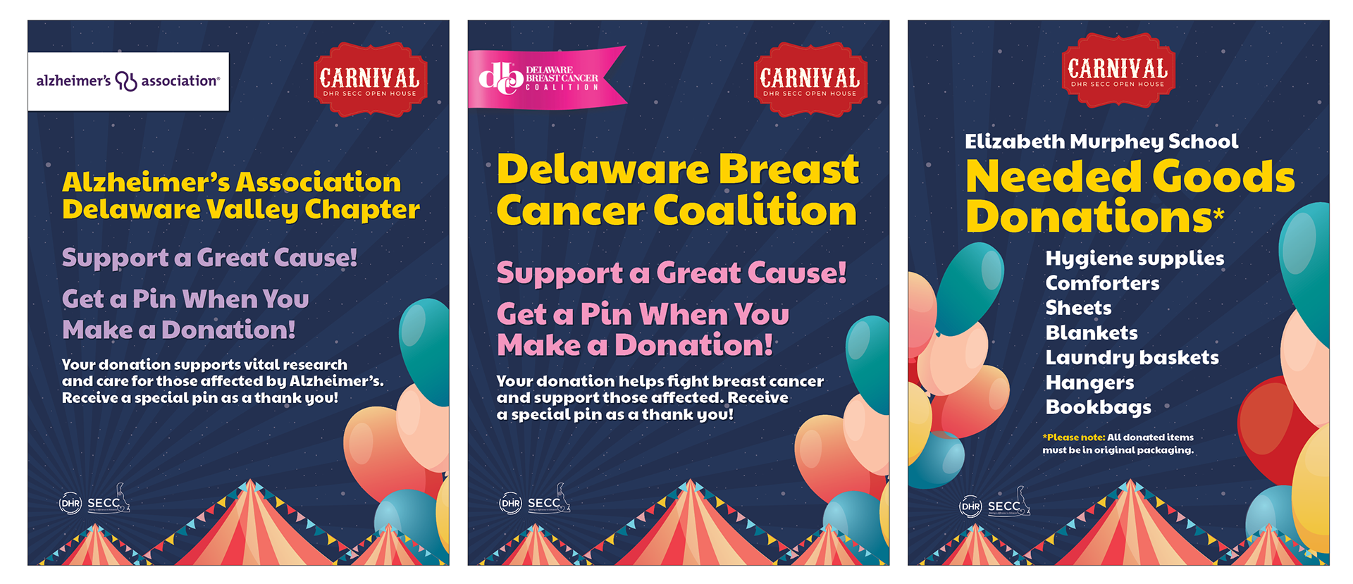 On the day of the event, colorful, coordinated signage both directed participants to the games and explained the rules. Additional signage was provided to inform attendees about opportunities to donate goods to local charities in need.